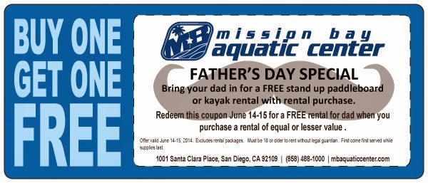 Bring dad in for a free rental this Father’s Day weekend News Home » Bring dad in for a free rental this Father’s Day weekend 06/10/2014 | Special Deals Bring dad in for a free kayak or SUP rental this Father’s Day weekend when you purchase a rental of equal or lesser value! Be sure to print the coupon below and redeem at the MBAC front desk. Happy Father’s Day! Print the coupon here >>> Join the conversation! (Visited 162 times, 1 visits today)