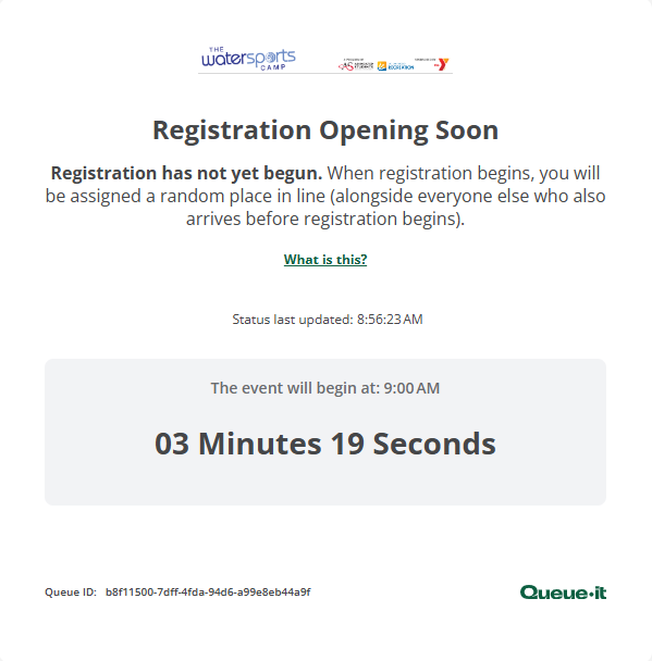 Our software provider has partnered with Queue It to improve system stability and better registration experiences. Fifteen minutes prior to summer camp registration opening, a virtual waiting room will display a countdown to opening. The virtual waiting room controls the flow of traffic to the camp registration site to provide the most reliable and equitable waiting experience possible during high-traffic registrations.