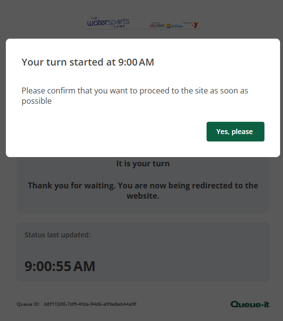 Once it is your turn to enter, you will be shown the image below and will need to click on “Yes, please” in order to enter the camp registration system.