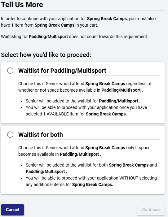 PLEASE NOTE: If you select the first option and later realize there are no alternate activities that you want to register for, you will need to remove the waitlisted camp from your cart and select “Waitlist for both” to complete your registration. This is the most common issue that families encounter and get stuck on during registration.